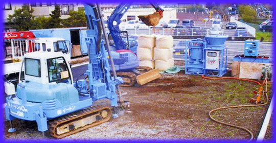 また、当社では配合ムラの無いセメントミルクを練るためコンピュータ制御の全自動プラントを使用し、 これをグラウトポンプによって流量操作しながら安定圧送します。これにより作られた均一な 品質の柱状体は表面積が大きく、先端支持力以外にも周辺地盤との摩擦力によって大きな支持力を得ることが出来ます。